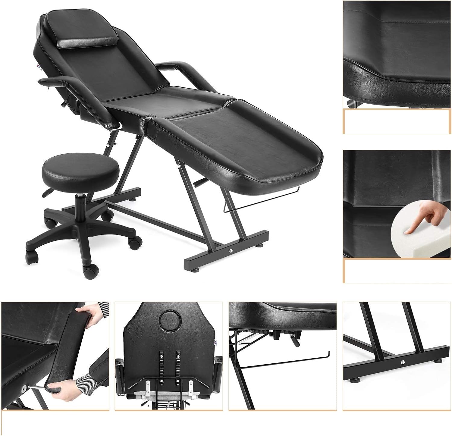 JINPALAY Camilla Masaje Plegable con Taburete 3 Zonas Cama de Masaje Profesional Fisioterapia Ajustable Reposabrazos Reposacabezas para SPA, Tatuaje, Facial, Pedicure Therapy (Negro)