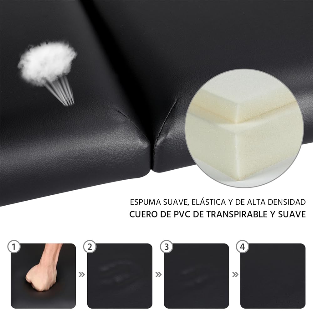 - Materiales duraderos: la cama de masaje plegable está construida con patas de aleación de aluminio, un cojín suave cubierto de PVC. La superficie es resistente al aceite y resistente al desgaste